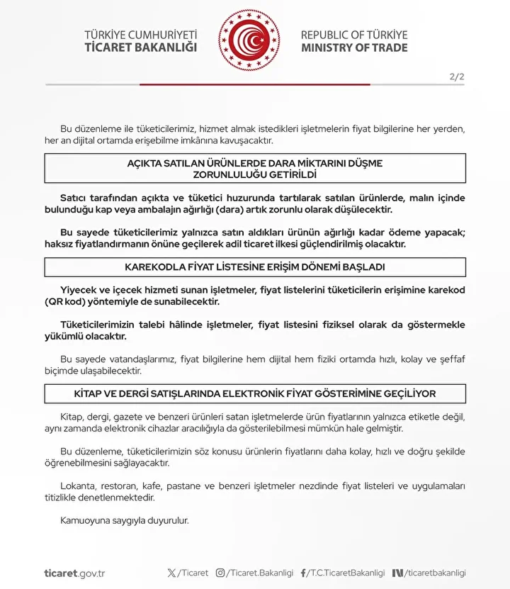 “Kitap, dergi, gazete ve benzeri ürünleri satan işletmelerde ürün fiyatlarının yalnızca etiketle değil, aynı zamanda elektronik cihazlar aracılığıyla da gösterilebilmesi mümkün hale gelmiştir. Bu düzenleme, tüketicilerimizin söz konusu ürünlerin fiyatlarını daha kolay, hızlı ve doğru şekilde öğrenebilmesini sağlayacaktır. Lokanta, restoran, kafe, pastane ve benzeri işletmeler nezdinde fiyat listeleri ve uygulamaları titizlikle denetlenmektedir.”