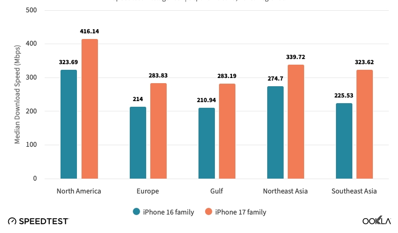 Speedtest.net’in sahibi Ookla, iPhone 17 modellerinin Wi-Fi performansını ayrıntılı olarak açıklayan yeni bir rapor yayınladı. Veriler, yeni iPhone’ların iPhone 16’ya kıyasla önemli ölçüde daha yüksek Wi-Fi hızlarına sahip olduğunu ve Apple tarafından tasarlanan yeni N1 çipinin avantajlarını ortaya koyduğunu gösteriyor.