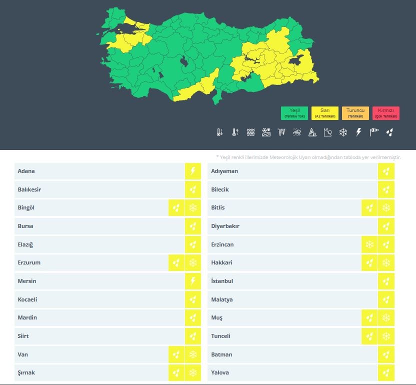 MGM’den gelen açıklamada ise İstanbul dahil 24 il için sarı kodlu uyarı yapıldı.