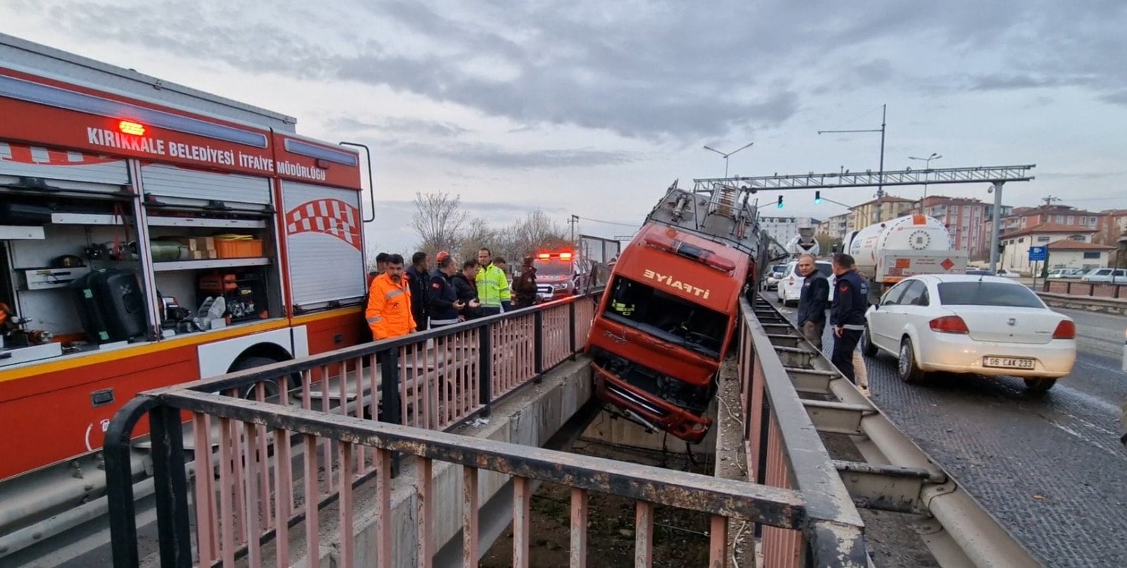 Kırıkkale-Kayseri kara yolu Bağdat Köprüsü’nde meydana gelen kazada, M.E. yönetimindeki 06 DH 2895 plakalı itfaiye aracının seyir halindeyken lastiği patladı. Lastiğin patlamasıyla savrulan araç, demir korkulukları aşarak iki köprünün arasındaki boşluğa sıkıştı.