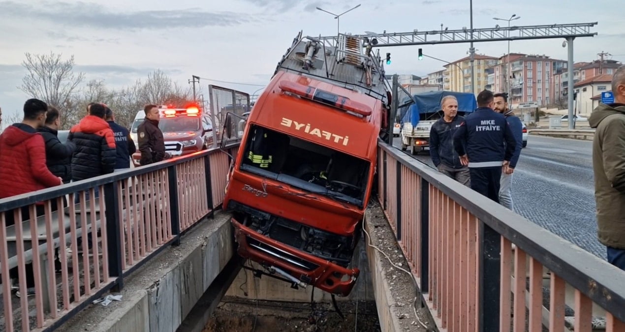 Kırıkkale Bağdat Köprüsü’nde lastiği patlayan itfaiye aracının savrularak iki köprü arasına sıkışması sonucu 3 personel yaralandı.