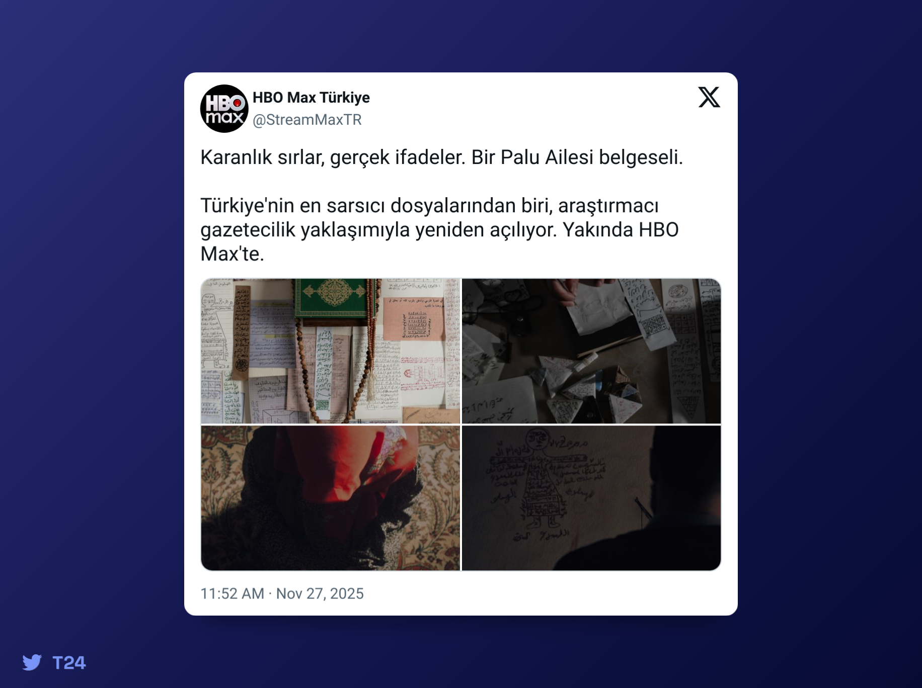 HBO, sosyal medya hesabı üzerinden yaptığı kısa paylaşımda, “Karanlık sırlar, gerçek ifadeler. Bir Palu Ailesi belgeseli. Türkiye’nin en sarsıcı dosyalarından biri, araştırmacı gazetecilik yaklaşımıyla yeniden açılıyor. Yakında HBO MAX’te” ifadelerini kullanarak Palu Ailesi ile ilgili bir belgesel hazırlığı yürüttüklerini duyurdu.