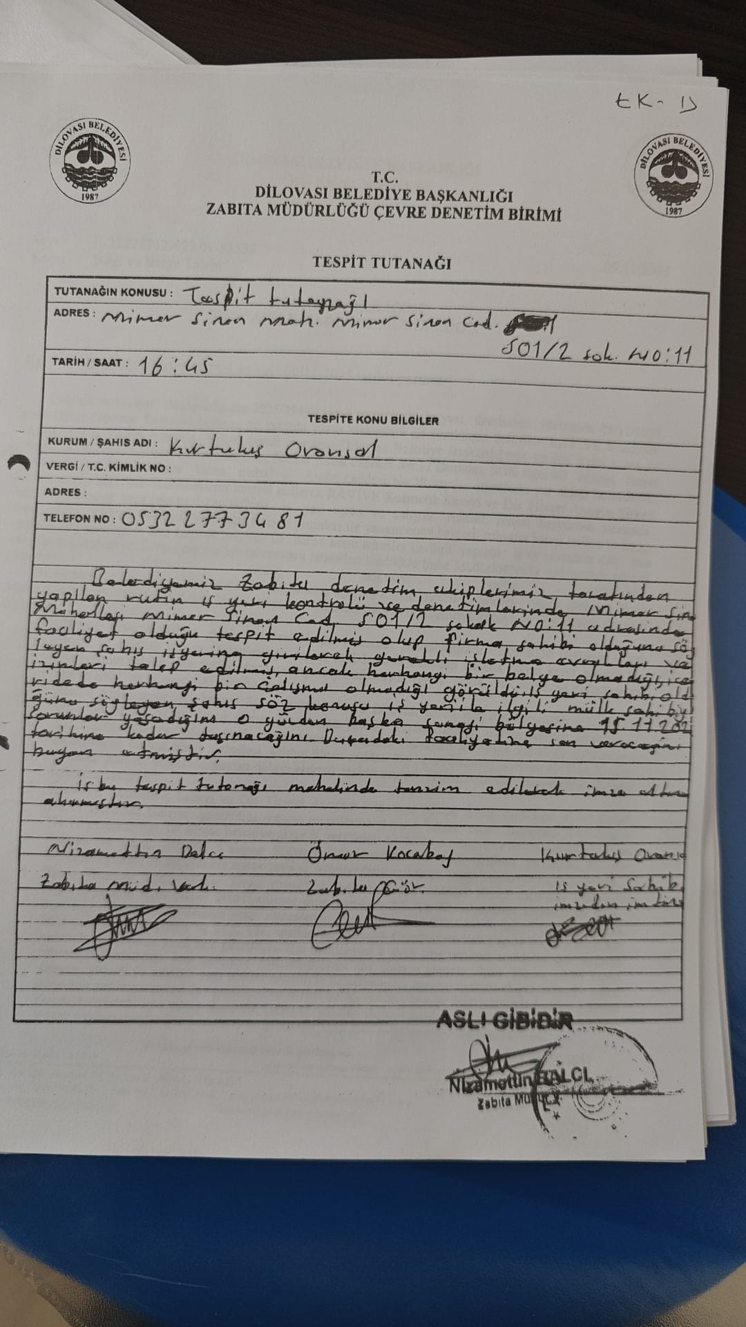 “Belediyemiz zabıta ekipleri tarafından yapılan rutin denetimlerde… iş yerine girilerek işletme evrakları ve izinleri talep edilmiş, ancak herhangi bir belge olmadığı, içeride herhangi bir çalışma olmadığı görüldü. İş yeri sahibi olduğunu söyleyen şahıs mülk sahibiyle sorunlar yaşadığını, o yüzden başka sanayi bölgesine 15.11.2025 tarihine kadar taşınacağını, buradaki faaliyetine son vereceğini beyan etmiştir.”